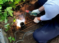 Далее мы приступили к изготовлению надёжного каркаса для массивной гранитной плиты. Взяв привезённые заранее сваи, мы вырыли относительно глубокую яму, и забили металлические трубы с двух сторон по её краям. Они и послужат двумя главными опорными точками для металлического каркаса, который мы тут же сварили из арматуры.