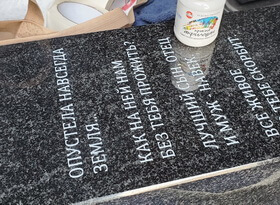 В ходе работы над данным заказом нам предстояло органично завершить оформление место захоронения, а именно установить у подножья памятника квадратную вазу из чёрного гранита, отличительной особенностью которой должна была стать выгравированная на лицевой стороне изделия эпитафия. Приняв заказ, мы, первым делом, создали трафарет надписи.